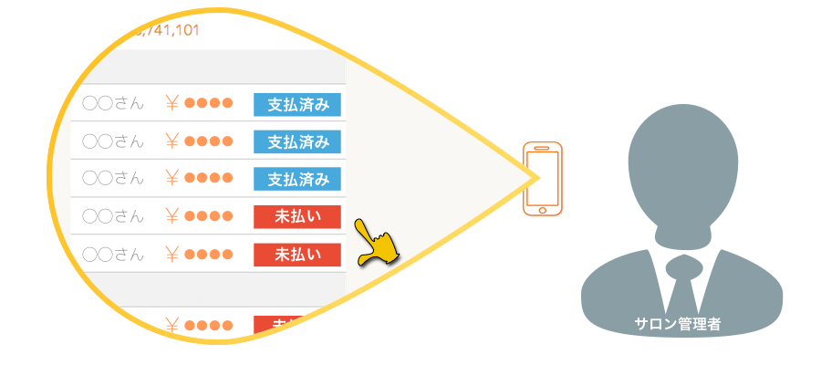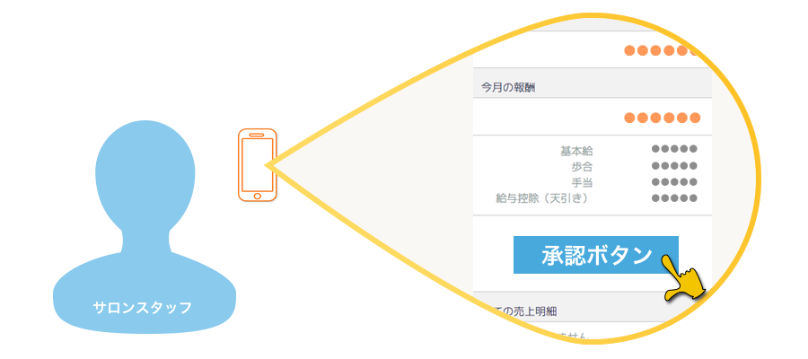 Orange(オレンジ)の特徴 その2 労務管理はペーパーレス 「報酬承認機能」と「支払い管理機能」を使えば労務管理がとてもスムーズになります。 給与明細書や請求書をやりとりする必要はなくなります。 報酬承認機能 サロンスタッフは自分だけの売上明細や給与明細をいつでも確認することができます。 給与明細の内容を確認して「承認ボタン」をタップするだけ。 承認された明細の金額はサロン管理者の「支払い待ちリスト」に自動で追加されます。 報酬承認ガイドを見る 支払い管理機能 承認済み明細の支払い金額はサロン管理者の「支払い待ちリスト」にリストアップされます。 振込が完了したら「支払い切り替えボタン」をタップするだけです。 全てのスタッフの支払い状況がタップ1つで管理できます。 支払い管理ガイドを見る